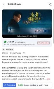 এতিয়া ৩১ অক্টোবৰত অসমৰ প্ৰতিটো ছবিগৃহত মুক্তি পাব জুবিন গাৰ্গৰ সপোনৰ ছবি ‘ৰৈ ৰৈ বিনালে’। শুকুৰবাৰে ছবিখনৰ অগ্ৰিম টিকট বুকিং আৰম্ভ কৰি দিয়া হয়। কিন্তু টিকট মুকলি কৰাৰ পিছতে গঢ়িলে অভিলেখ। ৰৈ ৰৈ বিনালেৰ ৭৪,০০০তকৈও বেছি ৰেটিং ইতিমধ্যে BookMyShow’ত অনুৰাগীয়ে কৰিছে। ইয়াৰোপৰি প্ৰায় ৩ নবেম্বৰলৈ সকলো টিকট বিক্ৰী হোৱাৰ তথ্য পোৱা গৈছে। অগ্ৰিম টিকট বিক্ৰীৰ পিছতে সকলো ছবিগৃহ ইতিমধ্যে হাউছফুল। ইয়াৰ বাবে BookMyShowৰ শীৰ্ষত চাৰ্চ লিষ্টটো আহিছে অসমীয়া ছবি ‘ৰৈ ৰৈ বিনালে’।